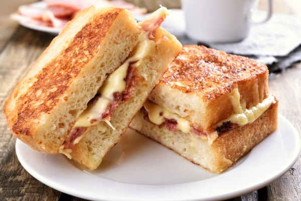 This grilled sandwich is served on white bread with bacon and melted cheese.