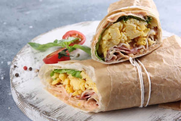 Boar’s Head ham, two eggs, cheese and home fries on a white wrap.
