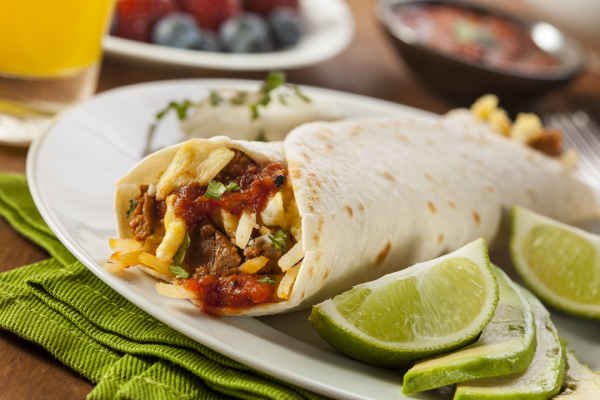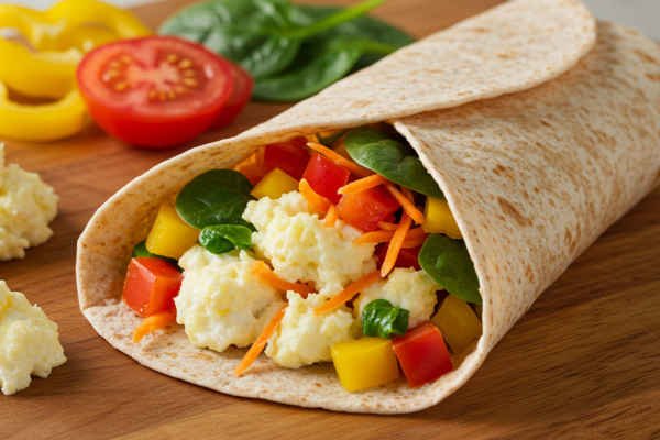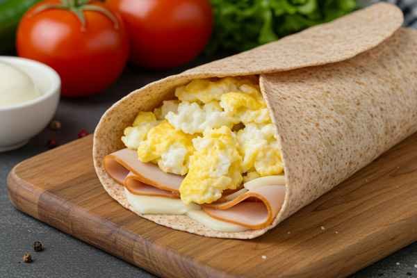 3 egg whites, fresh turkey, and Swiss on whole wheat wrap.